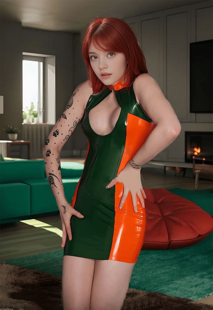 Relying on the material’s high-gloss feature, it forms a striking color-block contrast, creating a strong visual impact. The collision of green and orange not only shows vitality and personality but also conveys a cold, fashionable vibe through the latex’s gloss. The overall look is both bold, avant-garde, and full of individual charm.